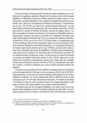Cal un aclariment relacionat amb les taules de valors emprades per a l’ela- boració de les gràfiques anteriors. Durant els tres primers cursos de la Segona República, el Ministeri d’Instrucció Pública donava les dades relatives a l’en- senyament secundari separades en dos capítols: els Instituts Nacionals per una banda, i per l’altra, les corresponents als Instituts Elementals.39 En particular, per al curs 1931/32 féu una relació de vuitanta Instituts Nacionals i en uns altres llistats relacionava les dades dels vint-i-un Instituts Elementals. Si hom pren només el nombre d’Instituts Nacionals, com han fet alguns autors, s’ar- riba a la paradoxal situació, que durant el curs anterior a la República hi havia norata-quatre instituts, més que en el primer curs republicà. Recordem que amb el decret del nou d’octubre de 1931 ja es crearen deu Instituts Nacionals, incloent-hi el d’Elx, per al curs 1931/32. D’altra banda, les estadístiques que es feren públiques pels governs franquistes també exclouen l’alumnat escola- ritzat durant la República als Instituts Elementals, en conseqüència afirmaren, tot i haver tancat molts instituts per al curs 1939/40, que hi ha més centres a l’inici de la dictadura que durant la República. Nosaltres hem considerat que calia sumar tots els instituts: els Nacionals més els Elementals, per poder fer la comparació entre els diferents cursos. Cal dir que tots els noms de localitats on hi havia un Institut Elemental, durant el curs 1930/31, apareixen en una relació única d’instituts corresponent a aquest curs. Notem que, per exemple, a la província d’Alacant, del curs 1929/30 al 1932/33, s’ha passat de dos insti- tuts a quatre i el nombre d’alumnes que cursen estudis secundaris també s’ha duplicat.