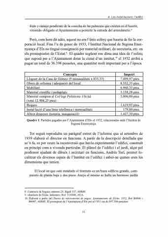 Però, com hem dit adés, aquest no era l’únic esforç que hauria de fer la cor- poració local. Fins l’u de gener de 1933, l’Institut Nacional de Segona Ense- nyança d’Elx no tingué consignació per material ordinari, de secretaria, etc. en els pressupostos de l’Estat.9 El quadre següent ens dóna una idea de l’esforç que suposà per a l’Ajuntament dotar la ciutat d’un institut,10 el 1932 arribà a pagar un total de 36.398 pessetes, una quantitat molt important per a l’època.