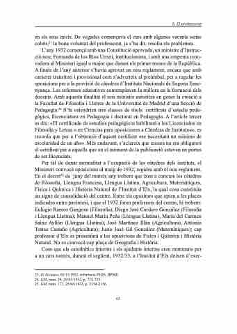 L’any 1932 començà amb una Constitució aprovada, un ministre d’Instruc- ció nou, Fernando de los Ríos Urruti, institucionista, i amb una empenta reno- vadora al Ministeri igual o major que durant els primer mesos de la República. A finals de l’any anterior s’havia aprovat un nou reglament, encara que amb caràcter transitori i provisional com s’adverteix al preàmbul, per a regular les oposicions per a la provisió de càtedres d’Instituts Nacionals de Segona Ense- nyança. Les reformes educatives contemplaven la millora en la formació dels docents. Amb aquesta finalitat el nou ministre autoritza en gener la creació a la Facultat de Filosofia i Lletres de la Universitat de Madrid d’una Secció de Pedagogia.24 S’hi estendrien tres classes de títols: certificats d’estudis peda- gògics, llicenciatura en Pedagogia i doctorat en Pedagogia. A l’article tercer es diu: «El certificado de estudios pedagógicos habilitará a los Licenciados en Filosofia y Letras o en Ciencias para oposiciones a Cátedras de Institutos», es recorda que per a l’obtenció d’aquest certificat «se necesitarà un mínimo de escolaridad de un año». Més endavant, s’aclareix que encara no era obligatori el certificat per a aquells que en el moment de la publicació estaven en portes de ser llicenciats.
