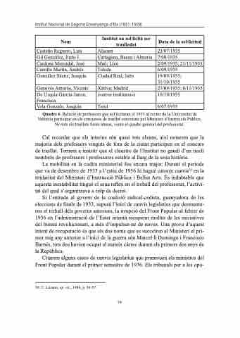 La mobilitat en la cadira ministerial fou encara major. Durant el període que va de desembre de 1933 a l’estiu de 1936 hi hagué catorze canvis50 en la titularitat del Ministeri d’Instrucció Pública i Belles Arts. És indubtable que aquesta inestabilitat tingué el seua reflex en el treball del professorat, l’activi- tat del qual s’organitzava a colp de decret.
