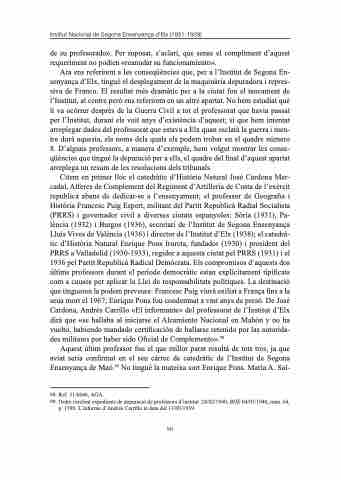 Ara ens referirem a les conseqüències que, per a l’Institut de Segona En- senyança d’Elx, tingué el desplegament de la maquinària depuradora i repres- siva de Franco. El resultat més dramàtic per a la ciutat fou el tancament de l’Institut, al centre però ens referirem en un altre apartat. No hem estudiat què li va ocórrer després de la Guerra Civil a tot el professorat que havia passat per l’Institut, durant els vuit anys d’existència d’aquest; sí que hem intentat arreplegar dades del professorat que estava a Elx quan esclatà la guerra i men- tre durà aquesta, els noms dels quals els podem trobar en el quadre número 8. D’alguns professors, a manera d’exemple, hem volgut mostrar les conse- qüències que tingué la depuració per a ells, el quadre del final d’aquest apartat arreplega un resum de les resolucions dels tribunals.