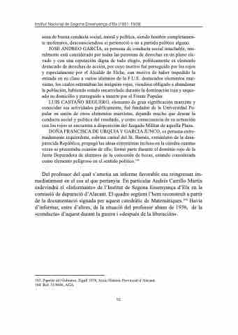 JOSE ANDREO GARCÍA, es persona de conducta social intachable, mo- ralmente está considerado por todas las personas de derechas en un plano ele- vado y con una reputación digna de todo elogio, políticamente es elemento destacado de derechas de acción, por cuyo motivo fué perseguido por los rojos y especialmente por el Alcalde de Elche, con motivo de haber impedido la entrada en su clase a varios alumnos de la F.U.E. destacados elementos mar- xistas, los cuales ostentaban las insignias rojas, viendose obligado a abandonar la población, habiendo estado encarcelado durante la dominación roja y saque- ado su domicilio y perseguido a muerte por el Frente Popular.