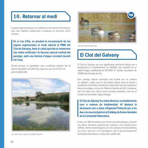 En el cas d’Elx, es produïx la incorporació de les aigües regenerades al medi natural al PNM del Clot de Galvany. Amb el cabal aportat es mantenen dos tolles artificials i la llacuna natural central del paratge, amb una làmina d’aigua constant durant tot l’any.
