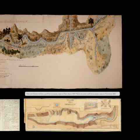 Plano del Pantano de Elche y perfil de la acequia, copia de Pedro Ibarra, 1891 / Plànol del pantà i perfil de la séquia, còpia de Pere Ibarra, 1891.
