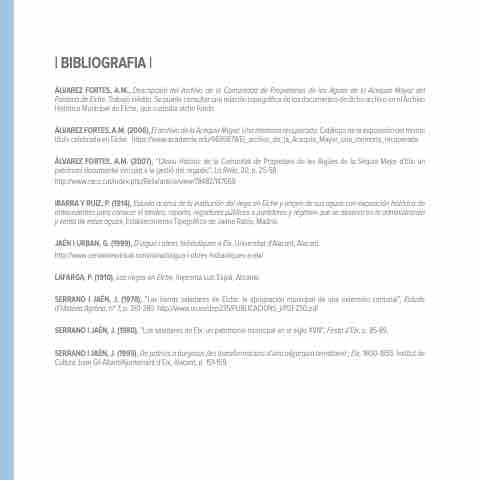 ÁLVAREZ FORTES, A.M. (2007), “L’Arxiu Històric de la Comunitat de Propietaris de les Aigües de la Séquia Major d’Elx: un patrimoni documental vinculat a la gestió del regadiu”, La Rella, 20, p. 25-58.