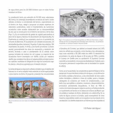 Como ya se ha apuntado, las características geomorfológicas de los parajes por los que transita la conducción de aguas, con proliferación de montes, ramblas y barrancos, y una cimentación de obra sobre suelos inestables y elásticos a base de arcillas, yesos y margas, cabalgados en ocasiones por niveles de conglomerados, y por tanto muy susceptibles a arrastres, erosiones y desprendimientos, provocaron prontamente desperfectos. A fines de 1790 la conducción rezumaba agua en algunos puntos y se había producido un hundimiento del terreno en la ladera de la Sierra del Murón que circundaba el pantano de Elche, afectando a la cañería (Fig. 5). La Junta de Aguas convocó a Coniedo, quien acompañado de otros maestros especialistas realizó un escrupuloso reconocimiento de la canalización. Los alarifes redactaron un informe que fue expedido al