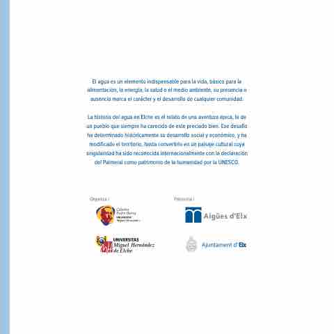 La historia del agua en Elche es el relato de una aventura épica, la de un pueblo que siempre ha carecido de este preciado bien. Ese desafío ha determinado históricamente su desarrollo social y económico, y ha modificado el territorio, hasta convertirlo en un paisaje cultural cuya singularidad ha sido reconocida internacionalmente con la declaración del Palmeral como patrimonio de la humanidad por la UNESCO.
