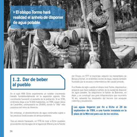 Es a finales de siglo cuando el obispo José Tormo, impulsará un proyecto que hará realidad el anhelo de la ciudad de disponer de agua potable. Se adquirieron la fuente de Barrenas, en Aspe, y se construyó una gran infraestructura que recorrería 16 km, salvando los desniveles del terreno con acequias cubiertas y acueductos.