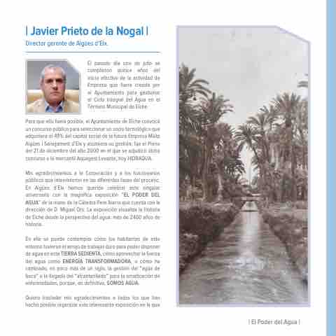 Mis agradecimientos a la Corporación y a los funcionarios públicos que intervinieron en las diferentes fases del proceso. En Aigües d’Elx hemos querido celebrar este singular aniversario con la magnífica exposición “EL PODER DEL AGUA” de la mano de la Cátedra Pere Ibarra que cuenta con la dirección de D. Miguel Ors. La exposición visualiza la historia de Elche desde la perspectiva del agua: más de 2400 años de historia.