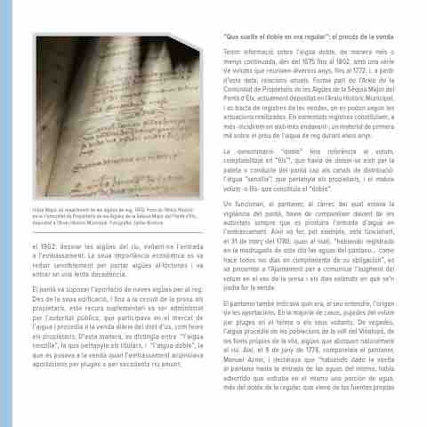 Tenim informació sobre l’aigua doble, de manera més o menys continuada, des del 1675 fins al 1802, amb una sèrie de volums que reunixen diversos anys, fins al 1772, i, a partir d’esta data, relacions anuals. Forma part de l’Arxiu de la Comunitat de Propietaris de les Aigües de la Séquia Major del Pantà d’Elx, actualment depositat en l’Arxiu Històric Municipal, i es tracta de registres de les vendes, on es poden seguir les actuacions realitzades. Els esmentats registres constituïxen, a més -incidirem en això més endavant-, un material de primera mà sobre el preu de l’aigua de reg durant eixos anys.